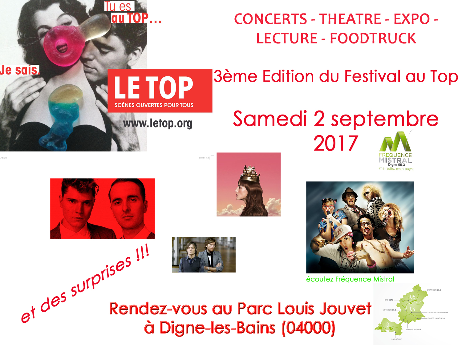 Organisé par Les Potes of the Top le 2 septembre, c’est la 3ème édition de ce Festival de soutien pour la rénovation des salles de spectacle du Top à Digne. Comme pour les précédentes éditions, le président de l’association le comédien Grégory Montel, annonce la venue d’artistes tels que Juliette Armanet, auteure, compositrice et interprète en pleine ascension, ou encore Her, ainsi que les Airnadettes, et d’autres surprises encore. Plus de 2500 personnes étaient présentes dès le 1er rendez-vous de ce Festival dans le parc Louis Jouvet à Digne-les-Bains, le public s’est encore étoffé l’an dernier puisqu’il est passé de 2500 à 3500. Surpris par un tel succès, les membres organisateurs ont prévu davantage de food trucks pour satisfaire tous les festivaliers en ce qui concerne la restauration sur place. Rappelons que pour le bon fonctionnement de l’opération, près d’une centaine de bénévoles s’activent sans relâche depuis le début de cette superbe aventure, aidé par les services de sécurité de la ville de Digne-les-Bains. Vous pouvez d’ores et déjà réserver vos places dans les divers points de vente. Je vous propose d’écouter Grégory Montel. Reportage Odile Frison.