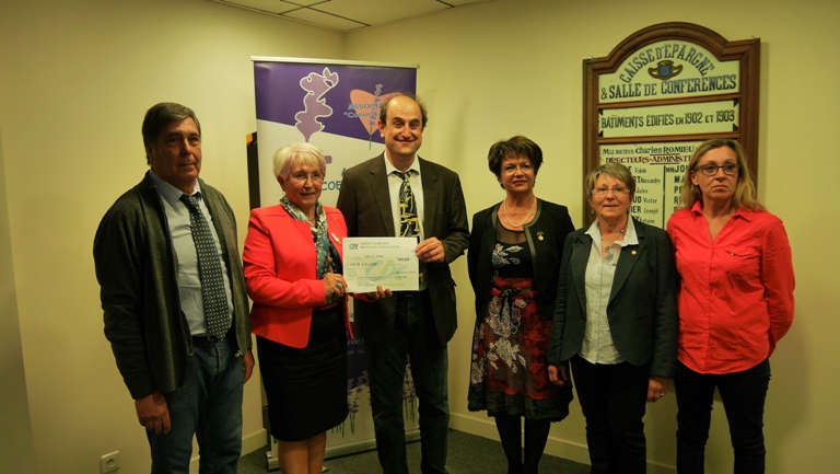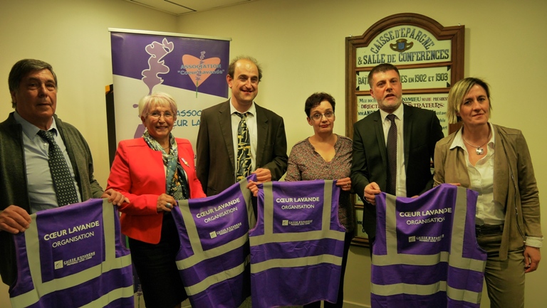Un chèque de 300 € et des gilets couleur lavande ont été remis au siège de la Caisse d’épargne à Digne-les-Bains. Jean Tripodi Président de l’association Cœur lavande était fier de recevoir ce chèque et de se voir remettre les jolis gilets aux couleurs de son association. Soroptimists international club de Digne et Marylou Frison, lors d’actions caritatives, contribuent à leur échelle à aider Cœur lavande. Depuis 11 ans Soroptimists, qui comptent 15 adhérentes, essaie tout au long de l’année d’aider les femmes qui sont maltraitées par leurs conjoints mais également combat l’illettrisme et milite pour l’environnement en organisant des vide-greniers, des repas ou encore des concerts. C’est grâce à des manifestations de ce genre qu’elles ont pu récolter 300€. La remise de ce chèque et des gilets s’est faite au siège de la Caisse d’épargne site de Digne centre car Bernadette Sandre directrice et son agence aide régulièrement Cœur lavande d’autant que Bernard Pieri directeur de l’agence habitat à Digne et Jean Tripodi se côtoient souvent. Les gilets aux couleurs de l’association résultent en partie grâce à leur collaboration au quotidien. Reportage Jean-Marc Léca.