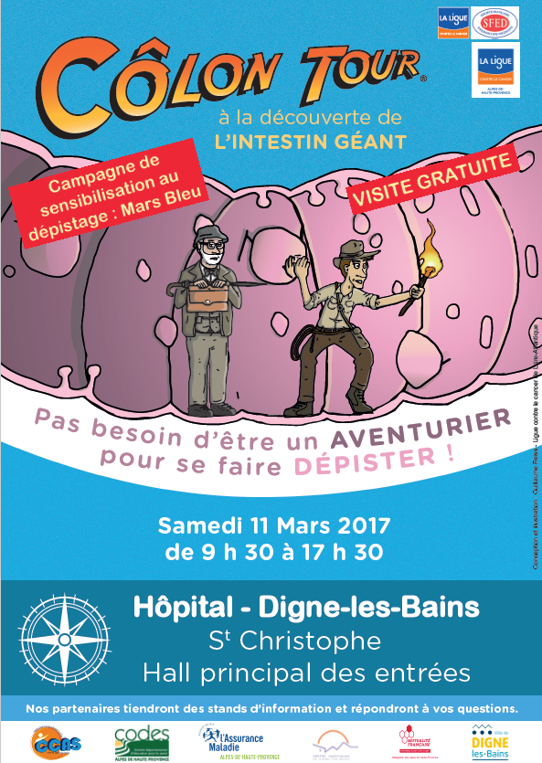 Dans le cadre de la campagne de sensibilisation au dépistage du cancer du côlon, le Centre hospitalier de Digne-les-Bains avait organisé un "côlon tour" dans le hall principal dernièrement. Ce jour là, il avait été possible de visiter une structure gonflable en forme de côlon et d'y rencontrer certains partenaires de la Ligue contre le cancer. Dans le cadre de « Mars Bleu », mois de promotion du dépistage contre le cancer colorectal le Docteur Gilbert Bordes chirurgien oncologue à l'Hôpital de Digne-les-Bains était présent pour expliquer les moyens de dépister ce cancer. Ce matin et en direct il était présent dans notre studio de fréquence mistral à Digne pour nous expliquer qu'il y a de nombreux moyens pour dépister ce cancer et surtout qu'il nous faut consulter notre médecin traitant qui est à même de nous conseiller pour prendre rendez-vous avec son service à Digne ou pas. La façon de se nourrir n'est pas à négliger et l'hygiène de vie doit être la plus exemplaire.