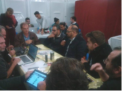Youcef Seddik et Louai Abbo Aljoud dans le studio des médias citoyens au Village de la Solidarité Internationale de Lyon le 14 novembre 2015