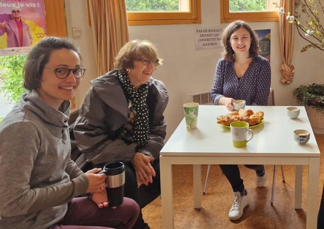 Tiffany, Marie-Paule et Caroline à la pause-café petit-déjeuner. Un moment convivial habituel au Studio de Fréquence Mistral