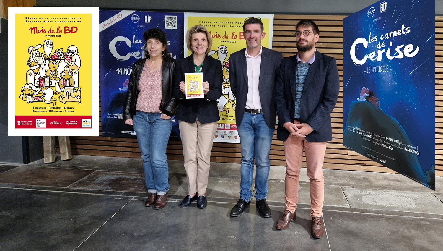 Au micro d'Odile Frison, Charlie-Camille Flores Directeur des médiathèques de l'agglomération et Catherine Boyadjian Directrice adjointe du réseau des lectures publiques de Provence Alpes Agglomération, cheffe de projet du mois de la BD.