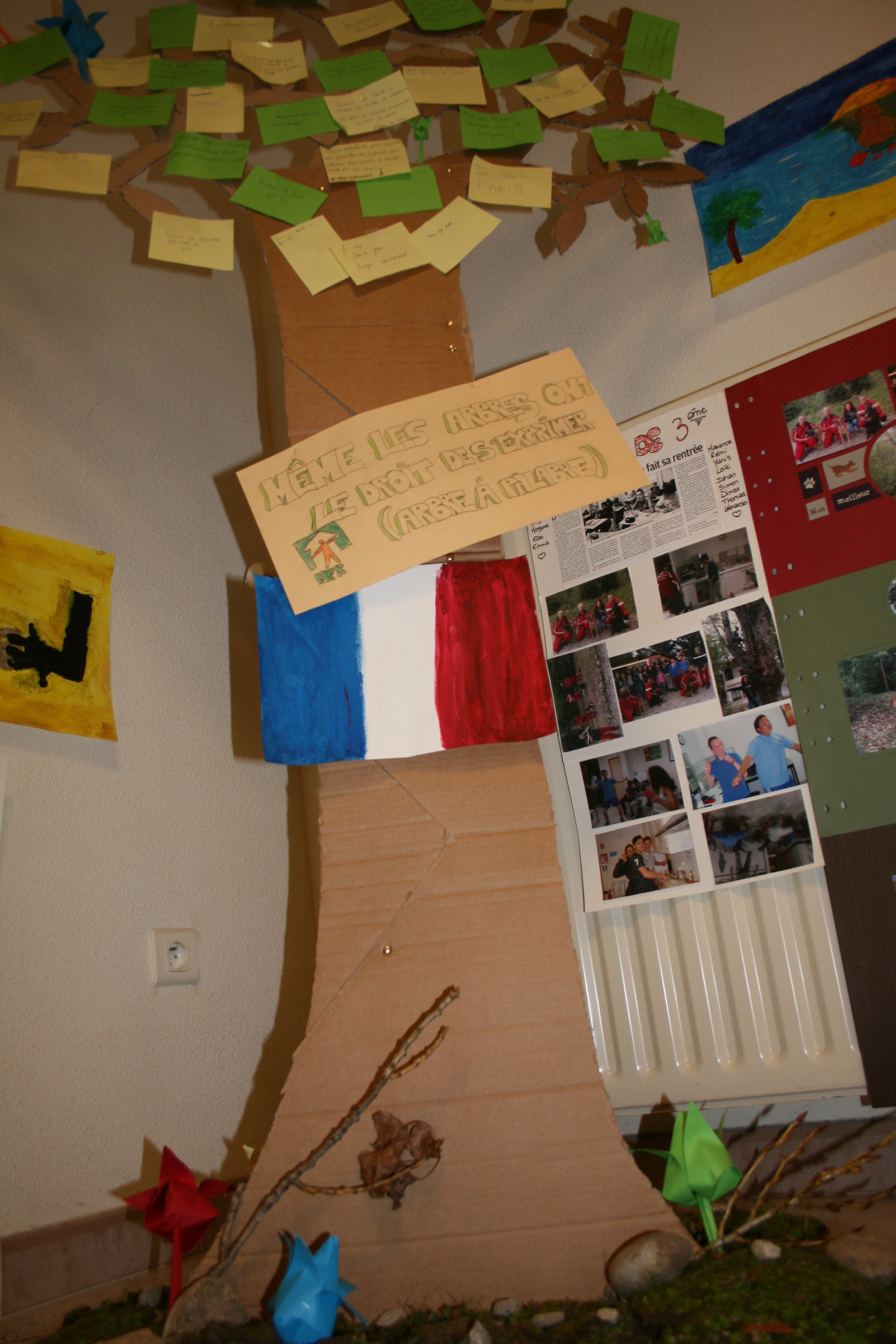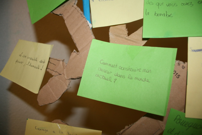 Premier pas dans la Maison Familiale et rurale de Peyruis avec un accueil en fanfare avec un Johan un peu énervé qui balance les chaises pour témoigner son mécontentement, mais s’excuse aussitôt. Rémy se dit lui d’emblée « pas concerné par ce qui s’est passé, ce n’est pas ma Région ». Le ton est donné. Et puis petit à petit la confiance s’installe, les langues se délient et on comprend que derrière ces jeunes adolescents en 3ème en alternance, pour certains un peu bourrus – n’est-ce pas Johan ?-, se cache en fait un grand cœur et surtout un grand besoin de comprendre. Pourquoi ces attentats ? Est-ce que c’est la 3ème Guerre mondiale ? Pourquoi ont-ils fait ça à Paris ? Est-ce que nous risquons quelque chose ici ? Des tas de questions et une réponse sous forme d’arbre à palabres à l’initiative de la directrice de la MFR Caroline Saez et de Myriam Bonnabelle, leur formatrice.