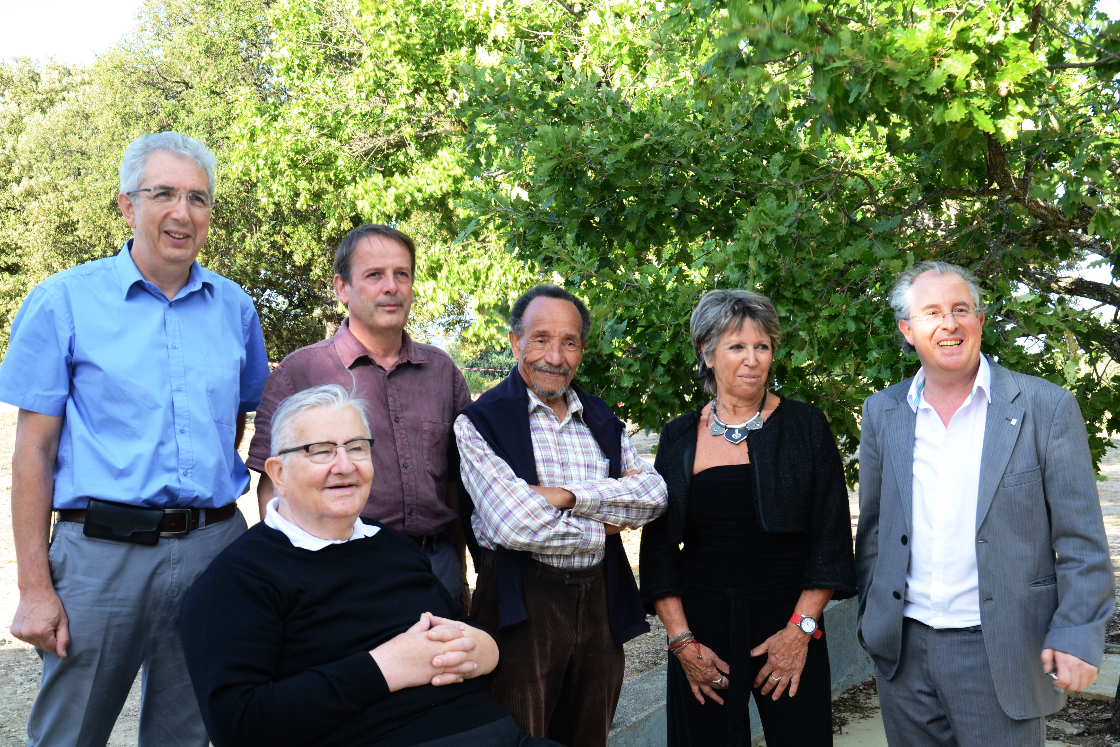 De g à d, Pascal Depoisson, maire de Saint Michel l'Observatoire, Dominique Ducerf directeur du centre d'astronomie, Pierre Rabhi, Claude Bouliou, présidente du centre astro et Philippe Courbon, à l'initiative de cette conférence. Enfin Jean-Marie Pelt. @Nathali...