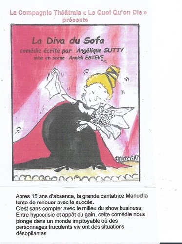 L’après-midi ne sera pas triste ce dimanche à Reillanne. La compagnie de théâtre de Pierrevert « Le quoi qu’on die » y présentera « La diva du sofa », une pièce d’Angélique Sutty mise en scène par Annick Estève. Cette dernière a rajouté quelques clins d’œil locaux au texte initial pour des effets comiques garantis.