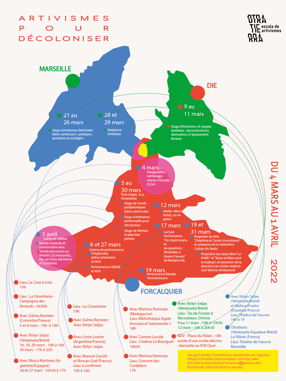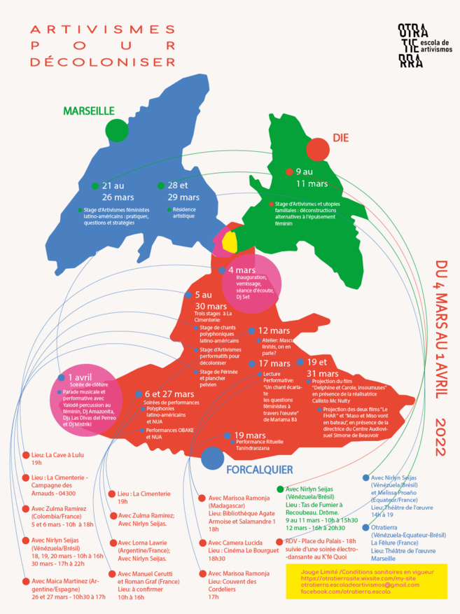 « Rencontres Artivismes pour Décoloniser » ce sont des rencontres organisées par Otratierra, une école d’artivisme menée par Melissa Proaño et Nirlyn Seijas, qui auront lieu du 4 mars au 1er avril à Forcalquier, Die et Marseille.
