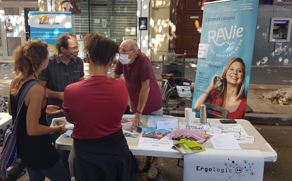 Serge Percepied présente Ergologic et RAVIE (Relais Assistants de Vie) au micro d'Odile Frison lors du Forum des associations à Digne-les-Bains début...