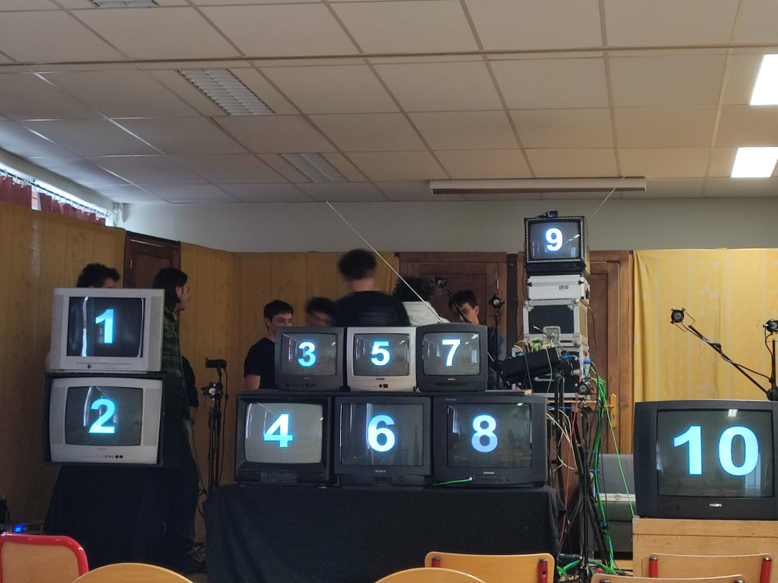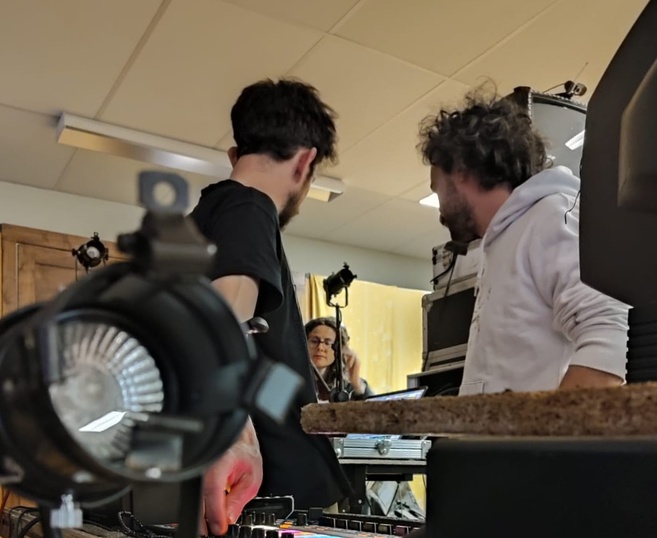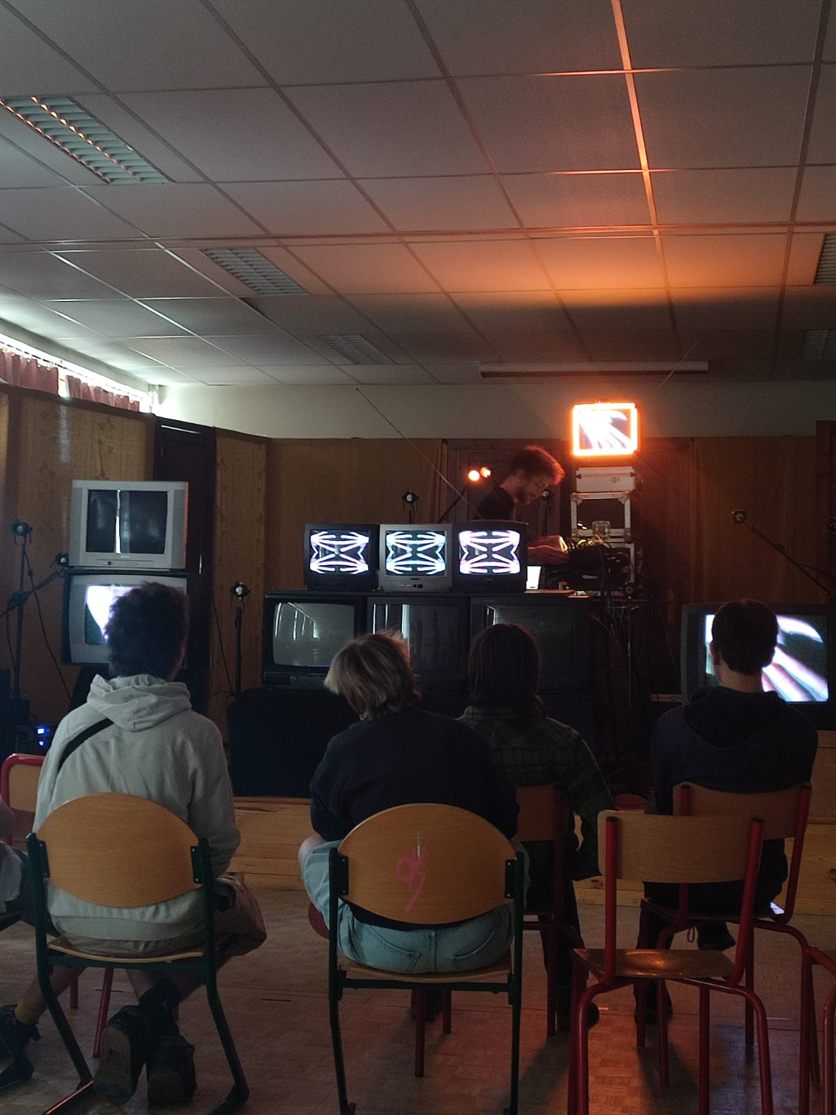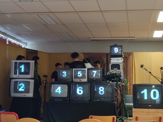 Les 2 artistes ont également rencontré les élèves du lycée d'Altitude le mercredi 24 avril. Entre télés, table de mixage et cables, l'installation destinée à la scène devient le temps d'un atelier un terrain de jeu et de découverte pour ces quelques élèves participants volontairement. Reportage.