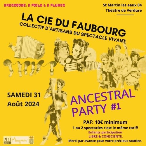 Le 31 août 2024 à Saint-Martin-les-Eaux dans le lieu unique du théâtre de verdure, venez fêter la fin de l'été et des vacances, venez vibrer au son de la soirée « ANCESTRAL PARTY » présentée par le collectif d'artistes, La Compagnie du Faubourg.