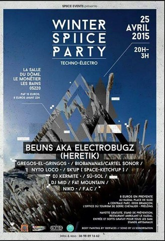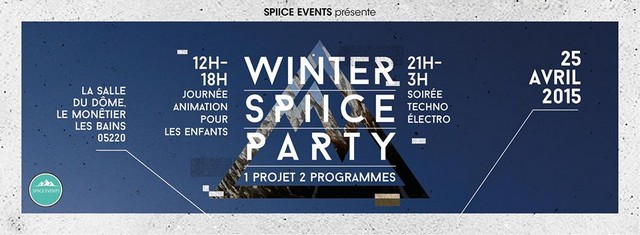 Située à Serre-Chevalier, l'association "Spiice Events" a pour objet d'organiser des stages, des formations et des événements dans le domaine des sports extrêmes. Après le beau succès du "Summer Spiice Party" voilà qui nous reviennent avec la version hivernale le "Winter Spiice Party"; Une belle journée est prévue le samedi 25 avril 2015 dans la salle du Dôme à Monêtier-Les-Bains: La première partie sera réservée aux enfants de 12h00 à 18h00 avec des animations, des ateliers, balades en poney...Puis à partir de 20h00 jusqu'à 3h00 soirée techno-électro avec pas moins de 7 DJ !! Belle organisation avec navettes gratuites mises en place, restauration ambulante sur place, stand de prévention, body painting et encore plein de surprises.