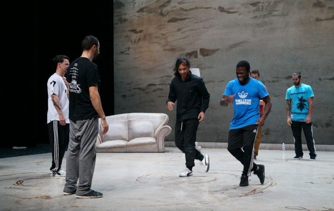 Le créateur a choisi une mise en scène d’une beauté épurée, un 45-tours qui crépite en flash-back, une complicité certaine entre ses danseurs qui se donnent corps et âme, sans tabous, sans retenue. En solo ou en groupe, sur une table, un fauteuil bancal. Equilibre, déséquilibre, défier la gravité, tordre son corps, toute la symbolique du hip-hop. Le public est bouche-bée, subjugué. Au moment du salut final le chorégraphe les présente un à un : Babacar, Bruce, Virgile, Erwan, Mabrouk, Adrien, Kevin, Artem, Mehdi, Nabil, Maxime .