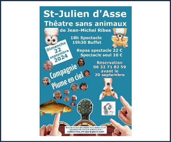 Pour le théâtre suivi du repas, réservations souhaitées au plus tard le 20 septembre au 06 32 71 82 59 (tarif 22€).
