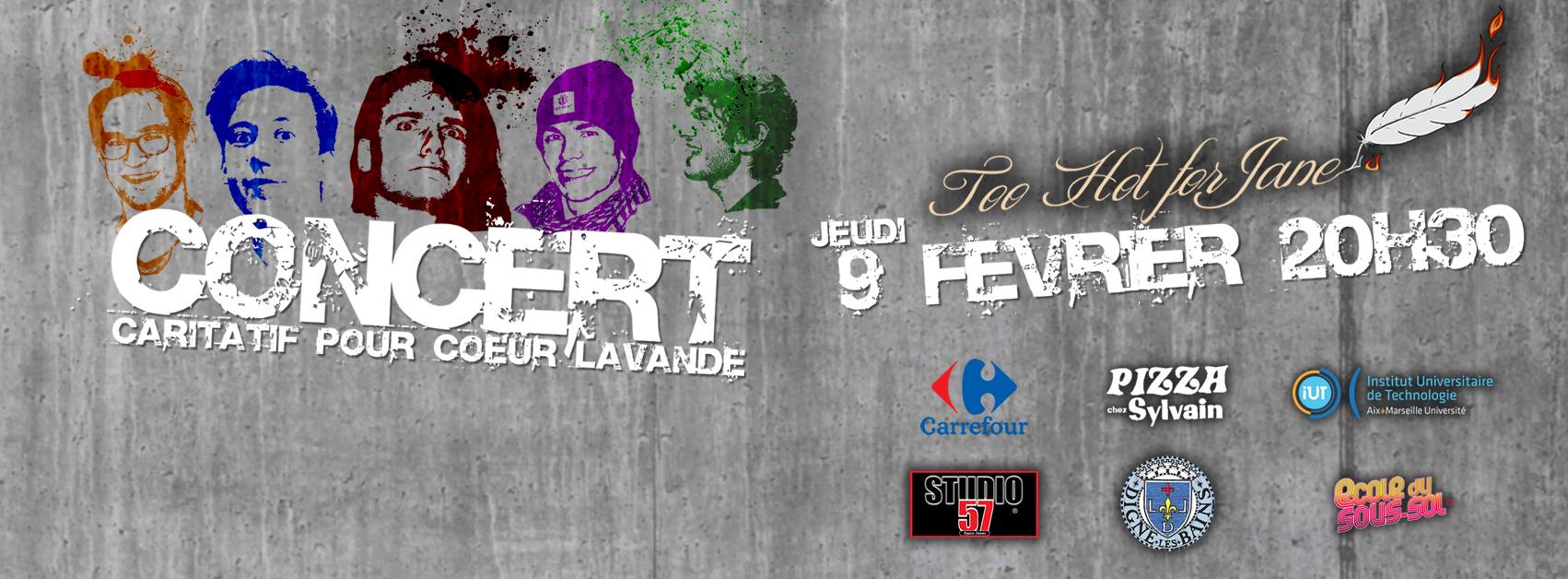 Le groupe Too hot for Jane a le plaisir de vous annoncer qu'ils seront présents à Digne-les-Bains le jeudi 9 février pour un concert au Studio 57, au plan d'eau des Ferréols, qui est organisé par des élèves de l'IUT de Digne. Ils joueront pour l'association Coeur Lavande qui a pour objectif de sensibiliser le public concernant les personnes en situation de handicap, les personnes âgées...
