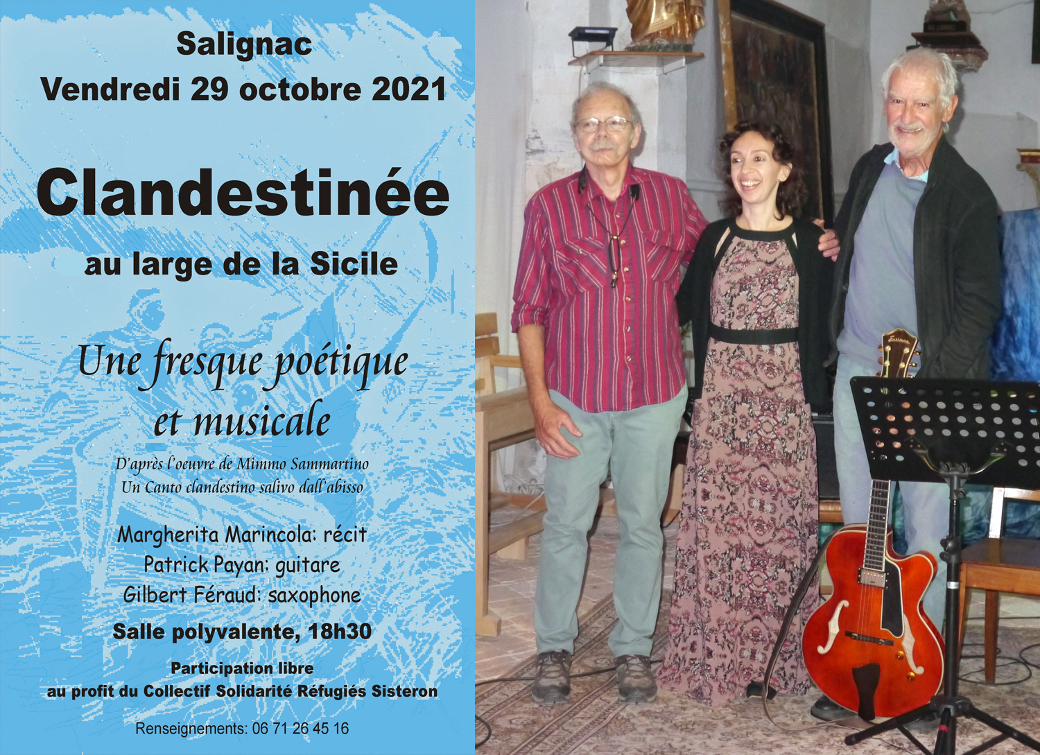 durée 50 min. Fresque poétique et musicale autour de morceaux de jazz, tirée de l'ouvrage d'un journaliste Sicilien, écrit à la suite du naufrage tragique de migrants au large de la Sicile : de très beaux textes forts qui traduisent avec poésie la tragédie, le désarroi de la population locale et l'indifférence, avec également quelques pointes d'humour. Entrée libre, chapeau en fin de soirée au profit de l'association Collectif Solidarité Réfugiés Sisteron.