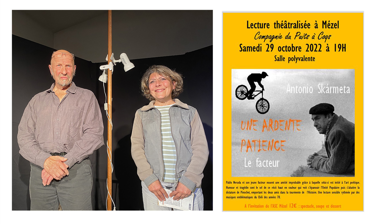Organisé par l'association sport et culture de Mézel, ce spectacle déjà donné lors des correspondances de Manosque en septembre 2022, sera interprété par Pierre Cheikbossian et Carol Battistini de la compagnie Le puits à coq. Un grand et beau moment de poésie d'environ une heure pour ceux qui connaissent l'oeuvre d'Antonio Skarmeta, et ceux qui le découvriront peut-être à la salle polyvalente de Mézel Samedi 29 octobre à 19h.
