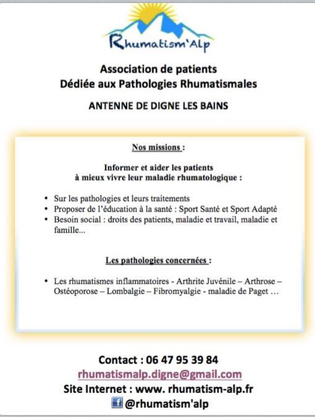 Mika Roux est venu nous présenter la conférence qui sera organisée salle de l'Abbé Ferraud le mardi 23 avril à 18h. Cette association, la première dans le département a pour but d'aider les portants de maladies rhumatismales et leurs proches à mieux vivre ou aborder les difficultés qui vont avec les différentes pathologies. Ce soir là, ce seront trois médecins rhumatologues qui interviendront et nous présenteront l'association.