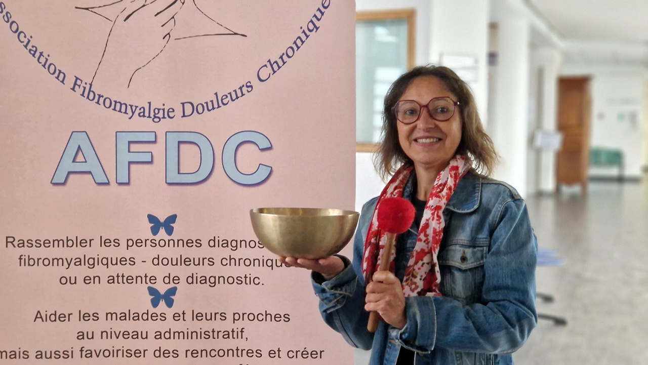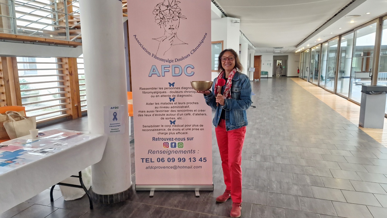 Docteur Gilbert Bordes présente cette journée ouverte à tous au micro d'Odile Frison, puis Sylviane Lauro Présidente de L'instant pour soi, présente cette association qui propose des soins de relaxation à destination du personnel hospitalier.