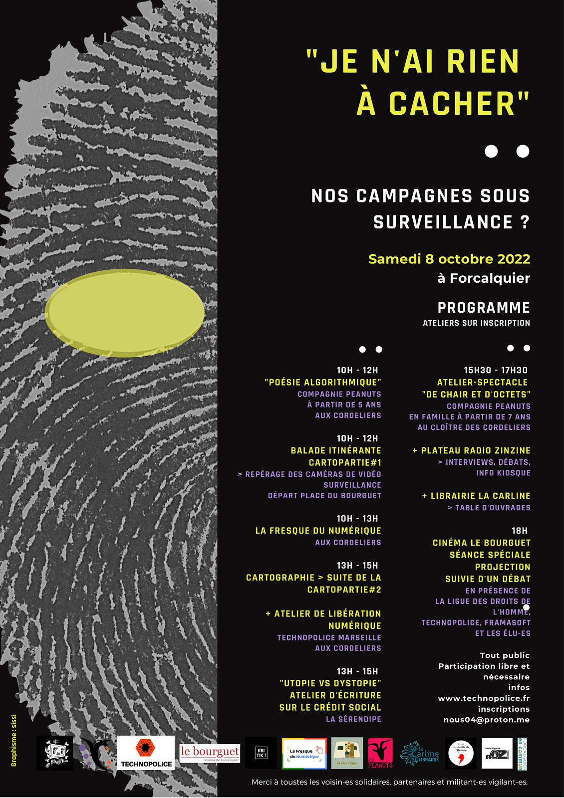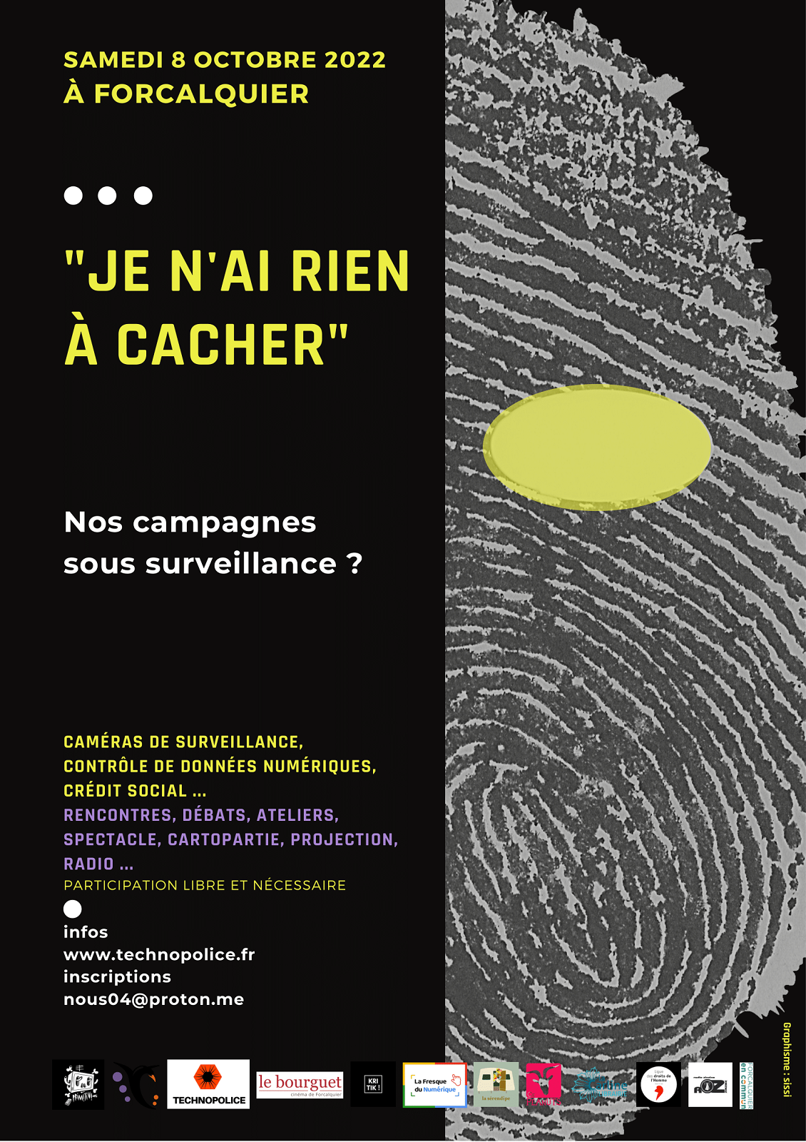 Le Samedi 8 octobre à Forcalquier « Je n’ai rien à cacher », c’est une journée de réflexion autour de la Vidéo-surveillance ouvert à toutes et tous, un moment pour aborder ensemble les questions et les nouveaux enjeux que posent la société 2.0, avec des rencontres, des débats, des ateliers, un spectacle, une projection…