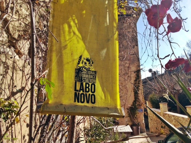 Place de l'Ormeau à Reillanne, sur une belle maison en pierre, un fanion jaune avec une inscription en noir : « Labo Novo ». Il s'agit d'une résidence d’artistes qui ouvre régulièrement ses portes au public – quand cela est possible. Maria Estevens, « la pilote en dérapage contrôlé de la Station Internationale Art Performance », présente le Labo Novo, ses activités, ses résidences, sa philosophie, son rapport à la création artistique… de l’international à la Provence.