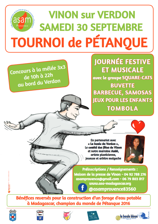 Véronique Douillet est notre invitée pour l’ASAM Provence. Cette association aide à la réinsertion de familles en grande précarité à Madagascar. Les bénéfices de la journée serviront à la construction d’un forage d’eau potable. Une journée festive et musicale et un concours à la mêlée pour trois joueurs, trois boules. Petit détail : les champions du monde de pétanque 2016 sont les… Malgaches !