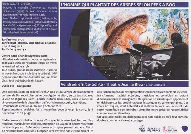 Le collectif Peek a boo était en résidence au Centre culturel René Char du 7 au 11 septembre 2020. Il présentera un extrait du spectacle visuel "L'homme qui plantait des arbres" Vendredi 11 septembre à 19h. Ouvert à tous.